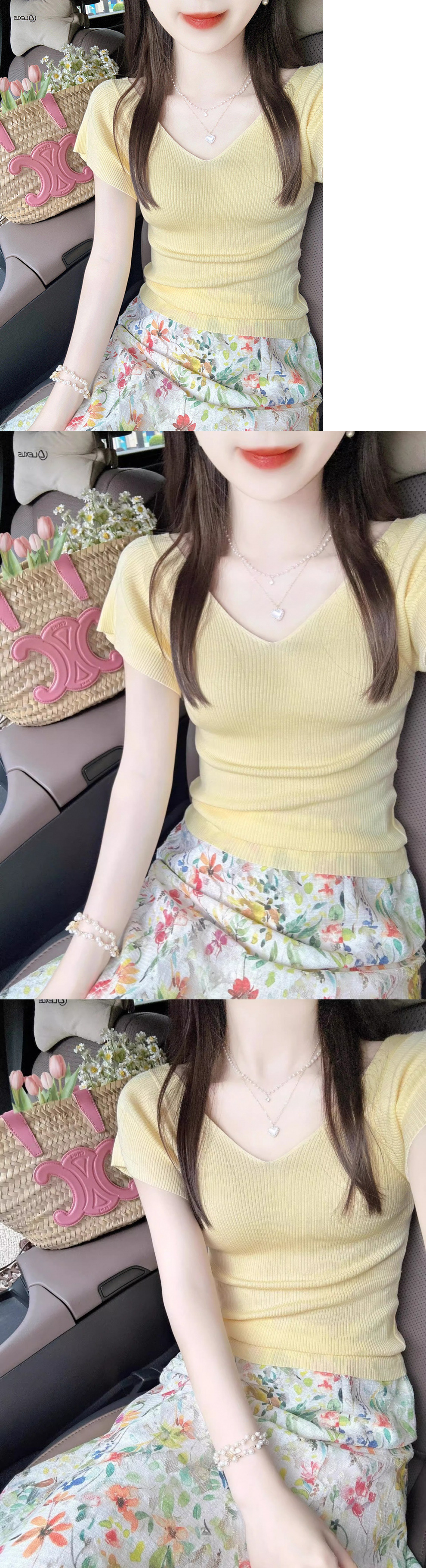 Cream-yellow V-neck Cap-sleeve Short-sleeve Womens Summer Top